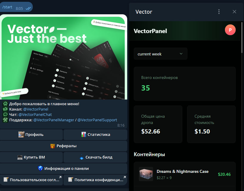 Panneau pour automatiser le farming de skins sur CS2. Vector émule le protocole du jeu, farme l'XP via Deathmatch et récupère le drop hebdomadaire de chaque compte Prime. Adapté aux fermes de 10 à 1 000+ comptes.